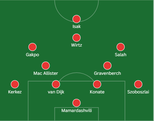 Arne Slot will hope Konate and Gravenberch prove fit enough to start, as their involvement could influence the approach in midfield and defence. With Alisson out, attention will be on how Liverpool handle United’s attacking transitions.